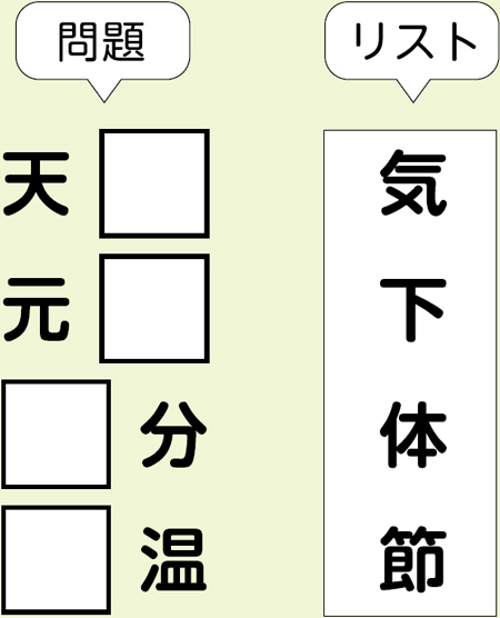 □には同じ漢字が入ります。リストから1つ漢字を選んで、4つの二字熟語を完成させてください。