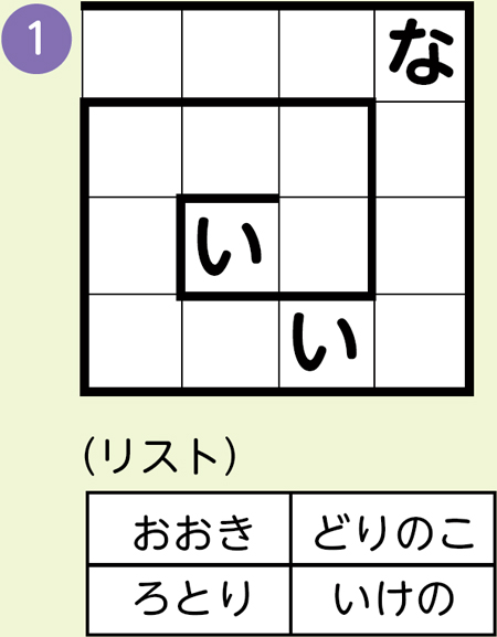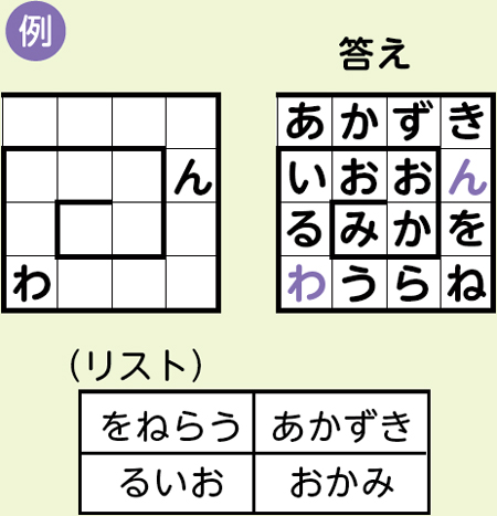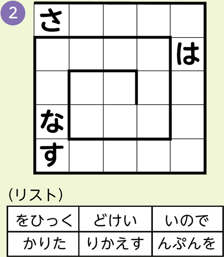 文章がつながるように、盤面の左上から中心に向かってリストの中から文字列を入れます。盤面の途中にある文字がヒントです。例題を参考に挑戦してください。