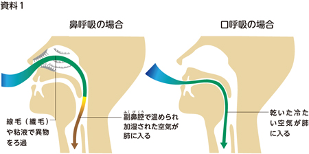 実はそれだけではありません。鼻呼吸であれば鼻毛や線毛(繊毛)の働きで異物を除去したり、吸い込んだ空気を加温・加湿して肺のほうへ送りこむことができます。それに対して口呼吸の場合、細菌やウイルスを含む汚れたままの空気が扁桃を直撃して、免疫力の低下などさまざまな不具合を引き起こすことになります(資料1)。