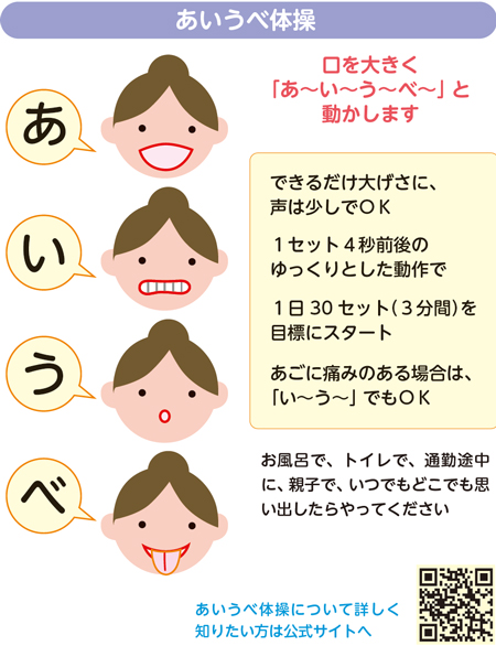 下のイラストを参考に、口を大げさに動かしてみてください。4つの動作を順番に繰り返します。声は出しても出さなくても構いません。「あ・い・う・べ」を1セットとして、1日30セットを目安に毎日続けると効果的です。