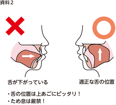 A:習慣化することが大切です。以前の調査で舌の位置が下がった状態にある人は、成人の約8割を占めました(資料2)。多くの方が自覚していないだけで、油断すると口呼吸になっている可能性があります。しかも加齢とともに舌の筋力は落ちていきますから、ますます口呼吸になるリスクが高まります。