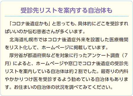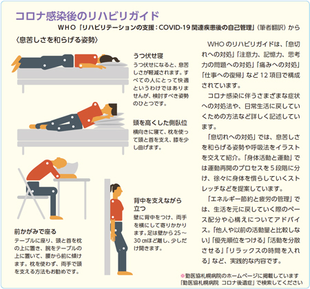 コロナ感染に伴うさまざまな症状から身体を快復させていくリハビリに関しては、WHOが出したリハビリガイドを私が翻訳して活用しています(次ページ別項)。症状に応じて、快復に向かうための自己管理の方法が具体的に書いてあります。感染直後の早めの段階から読めば、症状が長引く可能性を理解しつつ、見通しを持って安心して治療に取り組むことができます。