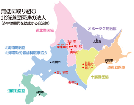 北海道民医連は積極的に無低に取り組んでいる。2002年の北海道勤医協を皮切りに、各法人が次々と無低を開始。現在は7法人で病院9、医科診療所20、歯科診療所5、介護老人保健施設4が実施している(図)。