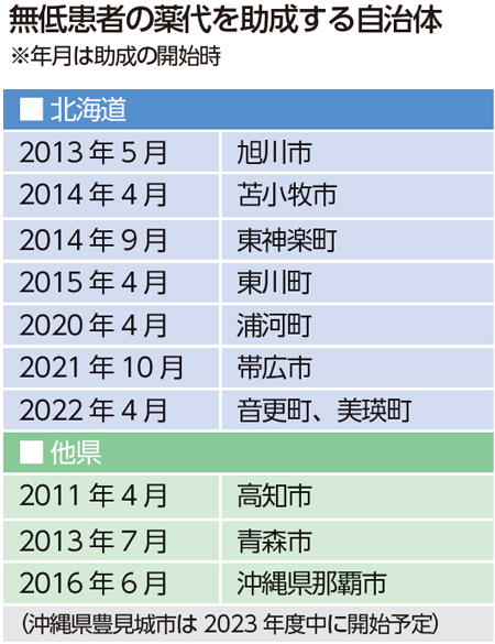 ただ、無低は院外薬局への適用はなく、診察代が無料や一部免除でも薬代がかかることから、治療を躊躇する患者も多い。そこで道内の民医連は、国の制度ができるまでの間、自治体が独自に薬代を助成する制度を作るよう粘り強く交渉。友の会の協力もあって、いまでは旭川市から美瑛町まで道内3市5町で助成を実現した。北海道以外では全国に3市しかない(表)。