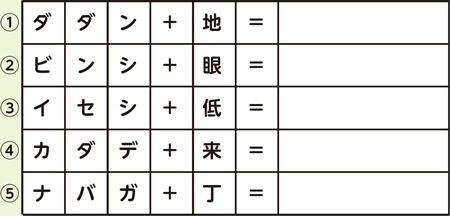 ①地ダンダ(地団駄) ②シンビ眼(審美眼) ③低シセイ(低姿勢) ④デ来ダカ(出来高) ⑤ナガ丁バ(長丁場)