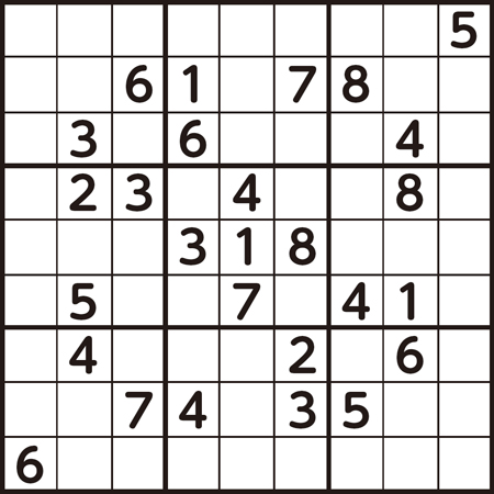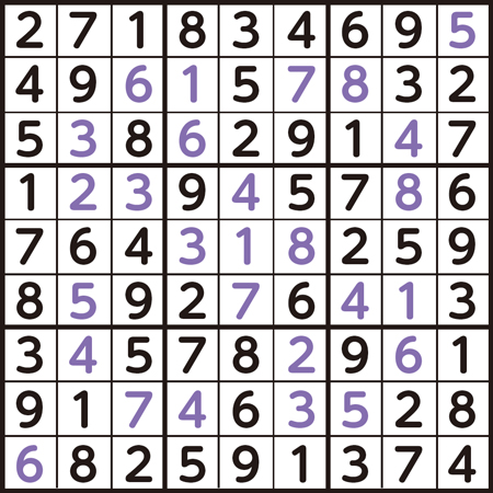 同じ列や同じブロックに同じ数字がだぶって入らないように、マスを埋めてください。
