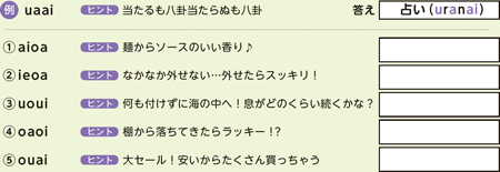 ある言葉をアルファベットにした際の母音(アイウエオ)だけが並んでいます。ヒントを手がかりにもとの言葉を推理してください。