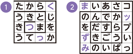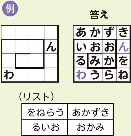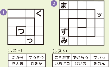 文章がつながるように、盤面の左上からぐるぐると中心に向かってリストの文字を入れます。盤面の途中にある文字がヒントです。例題を参考に挑戦してください。