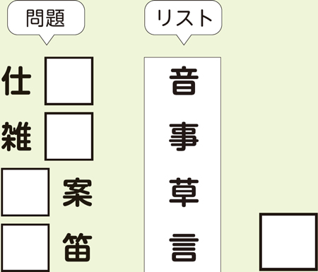 □には同じ漢字が入ります。リストから1つ漢字を選んで、4つの二字熟語を完成させてください。
