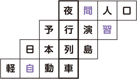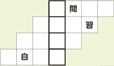 リストの漢字を□に入れて、横方向に4つの四字熟語ができるようにしてください。リストの漢字は一度しか使えません。すでに入っている漢字がヒントです。最後に太枠に入った漢字を上から順に並べてできる言葉を答えてください。