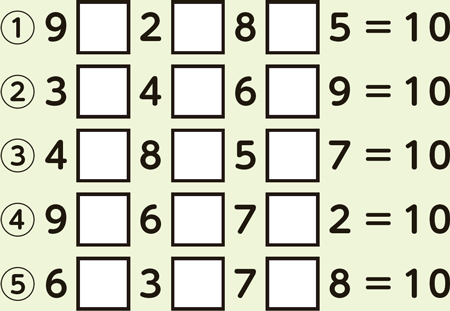 いずれも結果が10になる式です。□には+か-のどちらかが入ります。式を成立させてください。