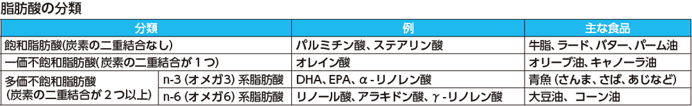 脂肪酸は、その中に含む炭素の二重結合の数によって「飽和脂肪酸」「一価不飽和脂肪酸」「多価不飽和脂肪酸」に分けられます。多価不飽和脂肪酸はさらに、二重結合の位置によって「n-3系脂肪酸」と「n-6系脂肪酸」に分けられます(表)。この「n-3系」「n-6系」が「オメガ3」「オメガ6」とも呼ばれます。