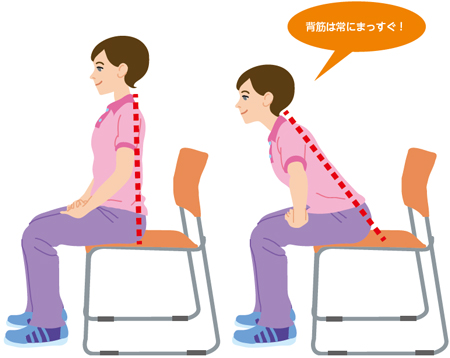 ①いすに浅く座り、足を腰幅に開く。