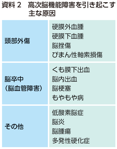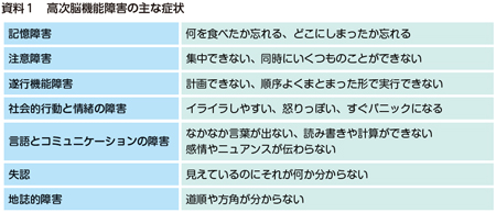 高次脳機能障害とは、事故や病気によって脳がダメージを受け、言語や思考、記憶などの知的機能に障害が起こることです(資料1)。外見上は障害が目立たないケースもある一方で、日常生活や社会活動に支障を来すことが多くあります。