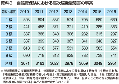 再び交通事故を例に挙げます。交通事故の被害者は治療しても後遺症が残った場合、自賠責保険の後遺障害認定を申請します。交通事故による高次脳機能障害は、毎年約8000人発生していると言われます。ところが、統計を見ると3000人程度しか認定されていません(資料3)。
