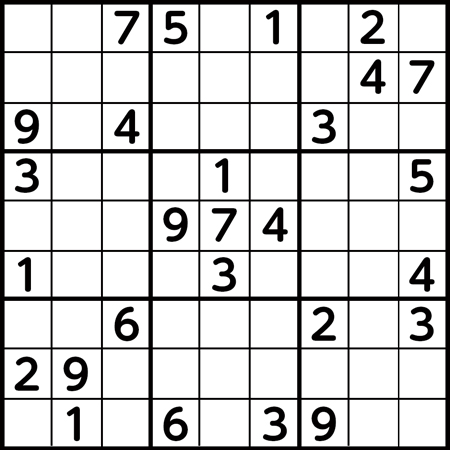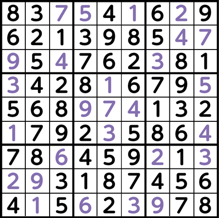 同じ列や同じブロックに同じ数字がだぶって入らないように、マスを埋めてください。