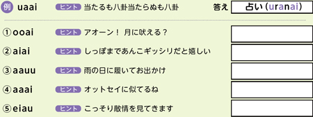 ある言葉をアルファベットにした際の母音(アイウエオ)だけが並んでいます。ヒントを手がかりにもとの言葉を推理してください。