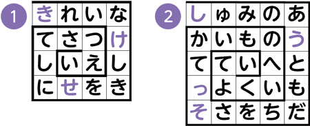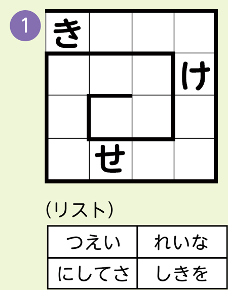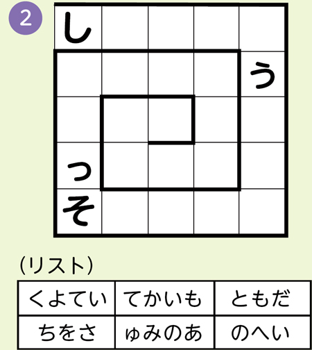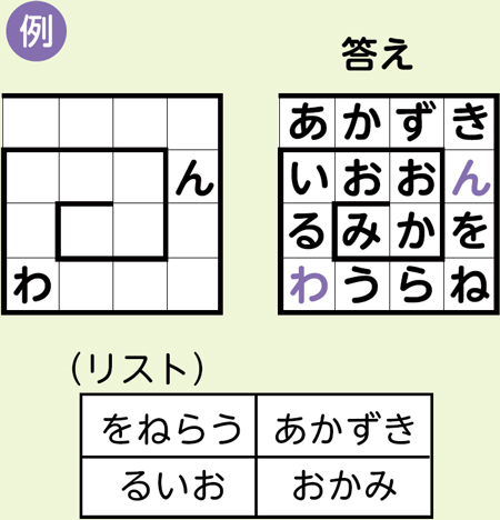 文章がつながるように、盤面の左上からぐるぐると中心に向かってリストの文字列を入れていくパズルです。盤面の途中の文字がヒントです。例題を参考に挑戦してください。