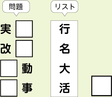 □には同じ漢字が入ります。リストから1つ漢字を選んで、4つの二字熟語を完成させてください。