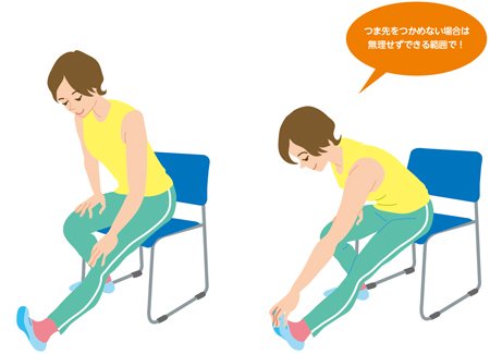 ①両足を腰幅に開き、いすまたは壁につかまる。