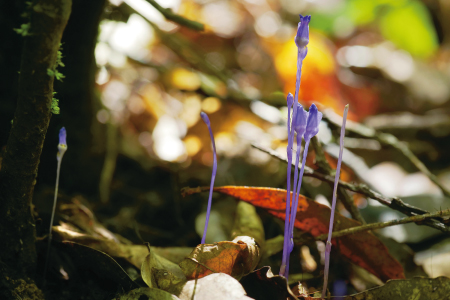 森にいると、いつも明確な生命のつながりを目にする。というより、すべてがつながっているのだと思う。写真の紫の植物は、奄美大島で出会ったルリシャクジョウ。「菌従属栄養植物」に分類され、葉がない10㎝ほどの植物だ。