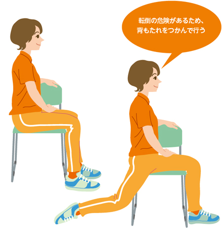 ①いすに浅く座り、両足首を膝より後方に引く。