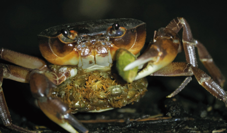 写真は林道で出会ったサワガニ。夜になると現れる。手には木の実を持ち、お腹にいっぱい子どもを抱く。ここにも、つながれていく生命の風景があった。