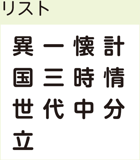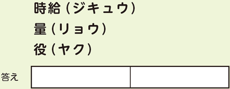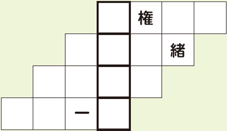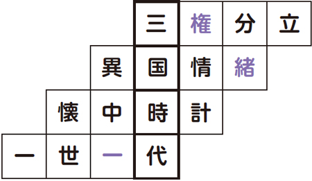 リストの漢字を□に入れて、横方向に4つの四字熟語ができるようにしてください。リストの漢字は一度しか使えません。すでに入っている漢字がヒントです。最後に太枠に入った漢字を上から順に並べてできる言葉を答えてください。