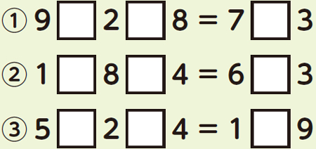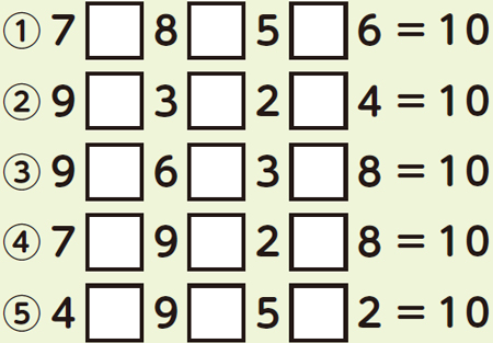 いずれも結果が10になる式です。□には+かーのどちらかが入ります。式を成立させてください。