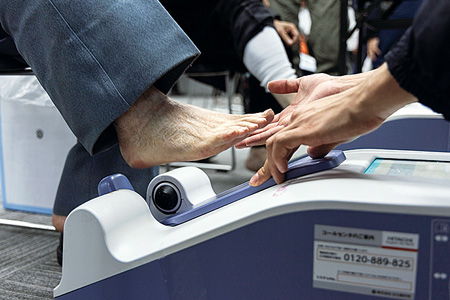 後半はいま話題の「ロコモティブシンドローム」(運動器症候群)について。ロコモティブシンドロームとは運動器の障害で介護が必要になりやすい状態のこと。理学療法士の阿部広和さんと三原良友さんの指導で、高さの違う箱からの立ち上がりや、大股で2歩進んだ距離から下半身の状態を診断するテストを実施した。