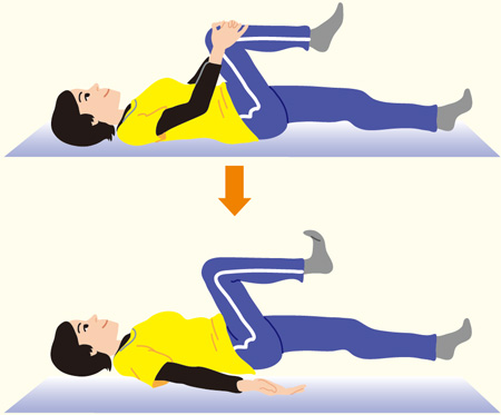 ①仰向けになり、両手で右膝を抱える。