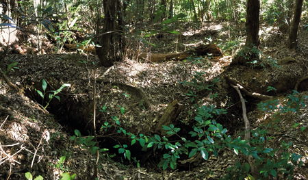 森にはまた、人工的な溝が縦横無尽に走っている。旧日本軍が掘った塹壕だ。写真のように深さ1mほどで、人ひとりがかろうじて移動できる幅しかなく、大勢の兵士や住民が詰めると、攻めこまれた時の逃げ場はないと思われる。