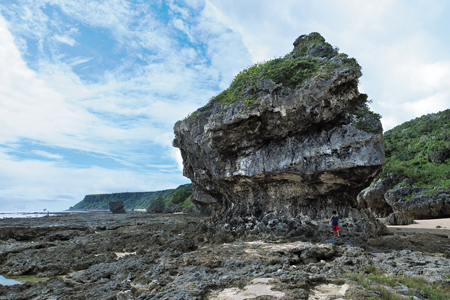 写真の具志頭浜は、沖縄戦の記憶も色濃い摩文仁の丘の東に位置する自然海岸。白砂の浜にいくつもの巨岩が立ち並んでいる。巨岩は海崖が剥がれ落ちたあと、長年の波や風雨の浸食によって遥かな時間をかけて現在の形になった。