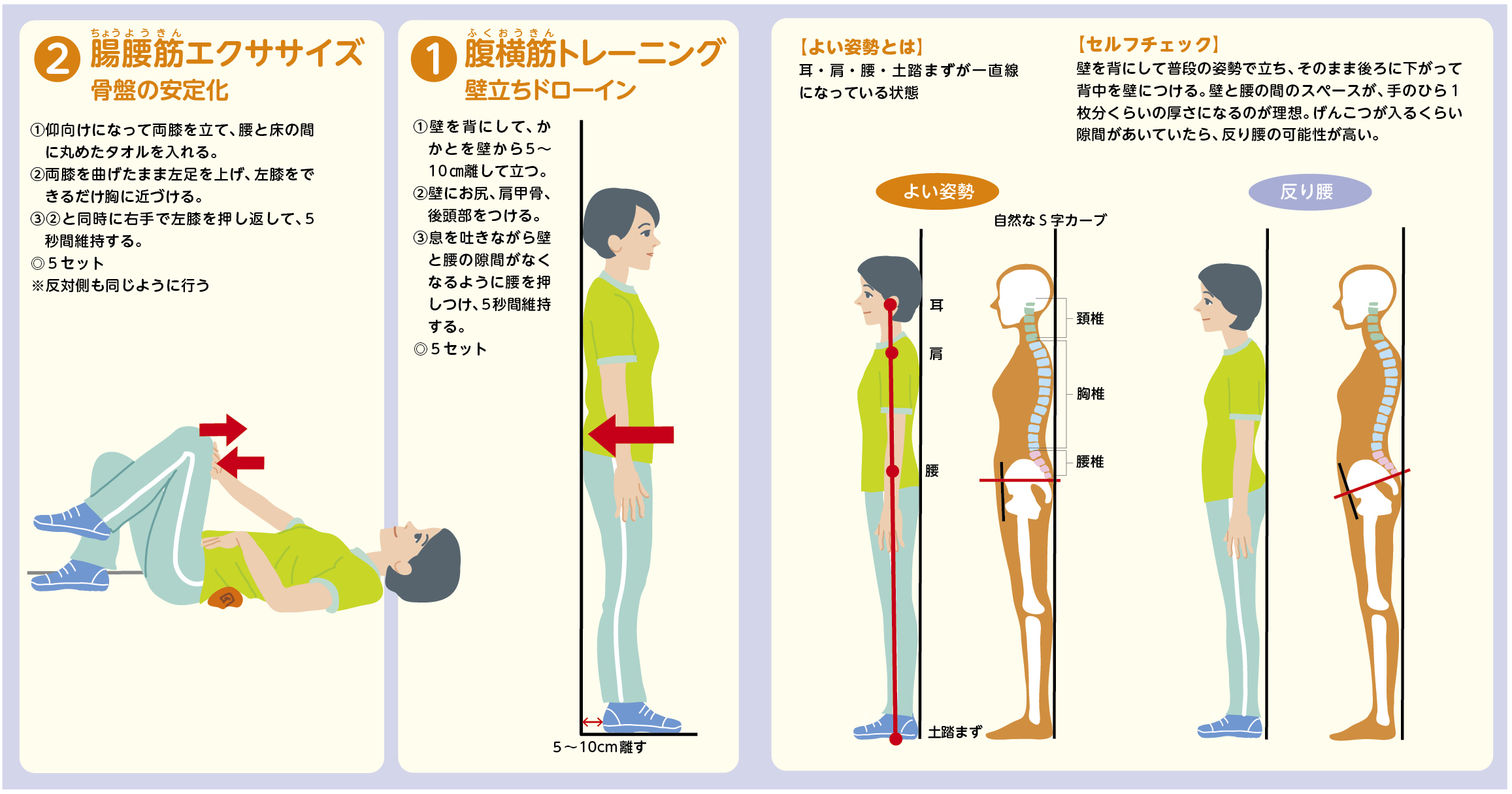 体幹を安定させる腹横筋や腸腰筋を鍛えることで改善できます。
