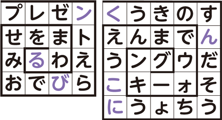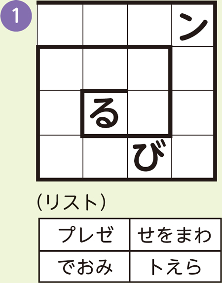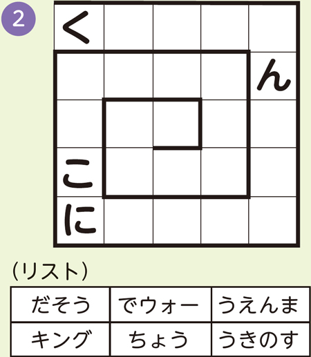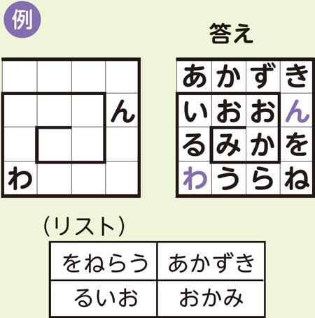 文章がつながるように、盤面の左上からぐるぐると中心に向かってリストの文字列を入れていくパズルです。盤面の途中の文字がヒントです。例題を参考に挑戦してください。