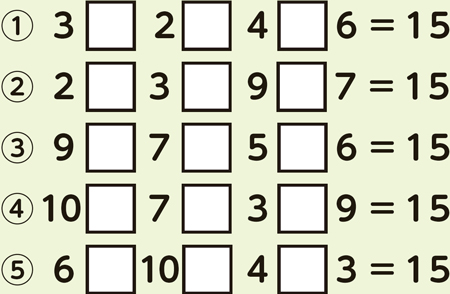 いずれも結果が15になる式です。□には+かーのどちらかが入ります。式を成立させてください。