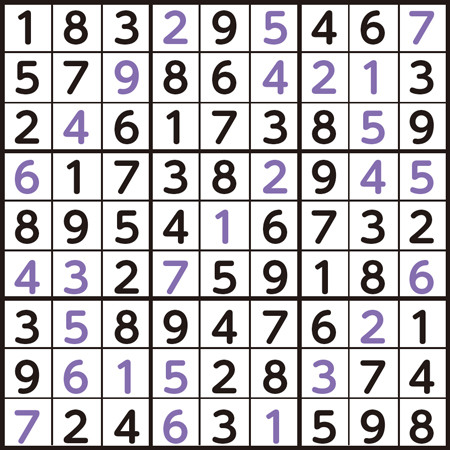 同じ列や同じブロックに同じ数字がだぶって入らないように、マスを埋めてください。