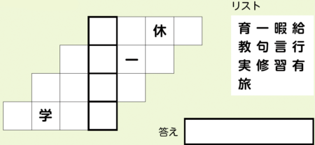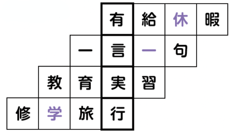 リストの漢字を□に入れて、横方向に4つの四字熟語ができるようにしてください。リストの漢字は一度しか使えません。すでに入っている漢字がヒントです。最後に太枠に入った漢字を上から順に並べてできる言葉を答えてください。