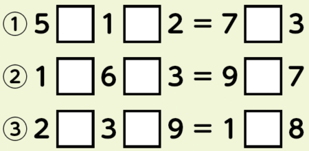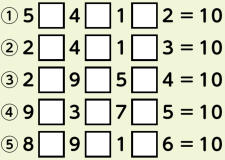 いずれも結果が10になる式です。□には+かーのどちらかが入ります。式を成立させてください。