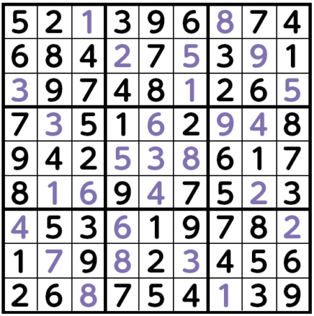 同じ列や同じブロックに同じ数字がだぶって入らないように、マスを埋めてください。