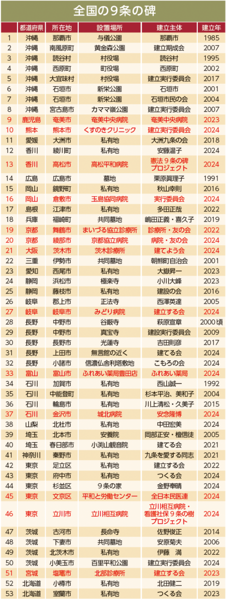 最近は9条の碑の建立ラッシュだ。全日本民医連が創立70周年(2023年)の記念事業として後押ししたこともあり、昨年できた17基のうち10基が民医連と共同組織が中心になって建てた(表)。民医連関係の碑は22年以降だけで13基完成し、誌面で紹介してきた(今号32ページにも掲載)。
