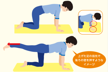 ③ ①の姿勢に戻り、左足を床と平行に上げて後ろへ伸ばし10秒間維持する。