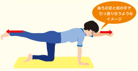 ③ ①の姿勢に戻り、左足と右手を床と平行に上げて伸ばし10秒間維持する。