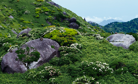山頂部では花崗岩に寄り添うようにシャクナゲが点在し、登山者を迎える。南にある屋久島だが、冬期の山頂は2~3mの積雪がある。