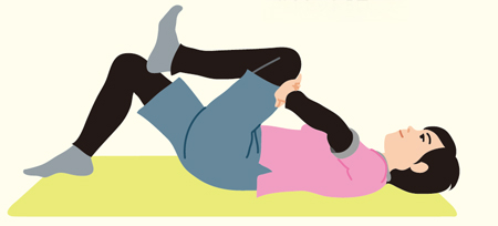 ④右膝を胸に引き寄せながら、両手で右膝を押して腸腰筋に負荷をかけ、3秒間維持する。