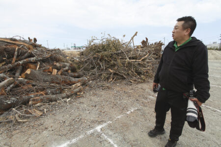避難先の茨城県古河市から双葉町に一時帰宅した大沼勇治さん(49歳)は、伐り倒され、切り刻まれて数mの丸太となった桜の木を前に悄然として佇む。