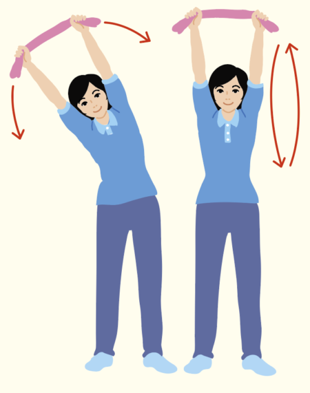 ①両足を肩幅に開いて立ち、両腕をまっすぐ前へ伸ばしてタオルを持つ。