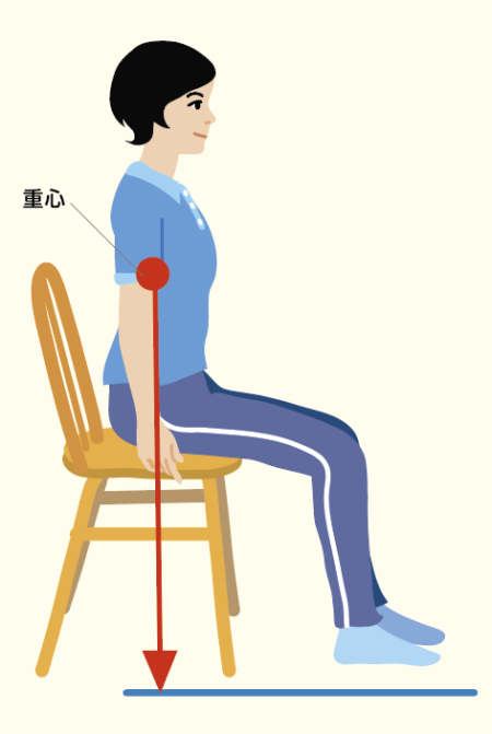 ①骨盤を立てて坐骨で座り、背筋を伸ばして肩の力を抜き顎を引く。