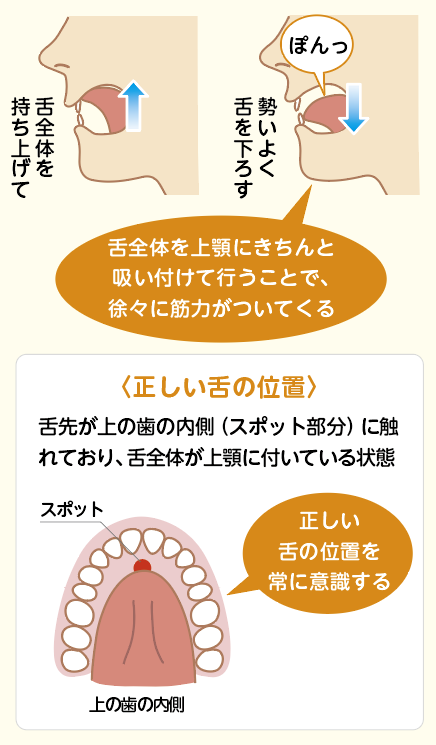 舌全体を上顎に吸い付けた状態を5秒間維持したあと、ぽんっと音が出るように勢いよく舌を下ろす