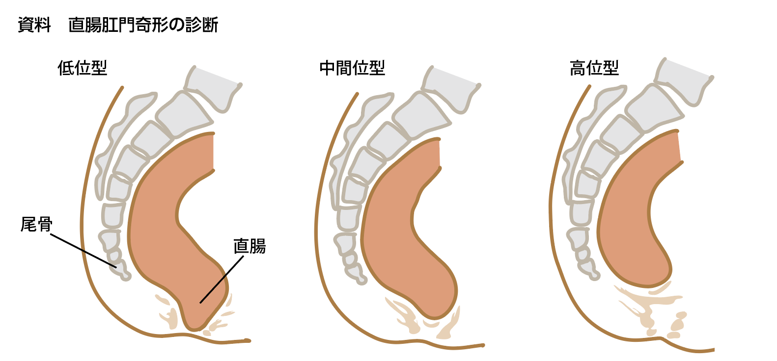 直腸肛門奇形は直腸末端の位置によって、低位型、中間位型、高位型に分けられます(資料)。病型によって治療方法が大きく異なるので、できるだけ速やかに検査・診断する必要があります。